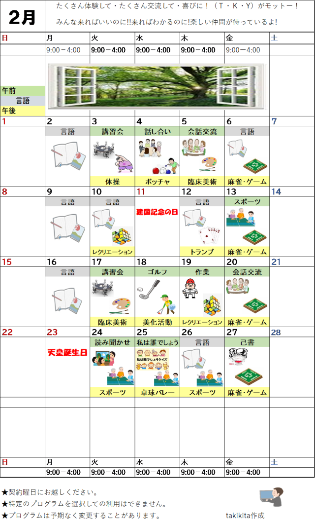 地域活動支援センターピア・さくら 令和8年2月のプログラム表です。
